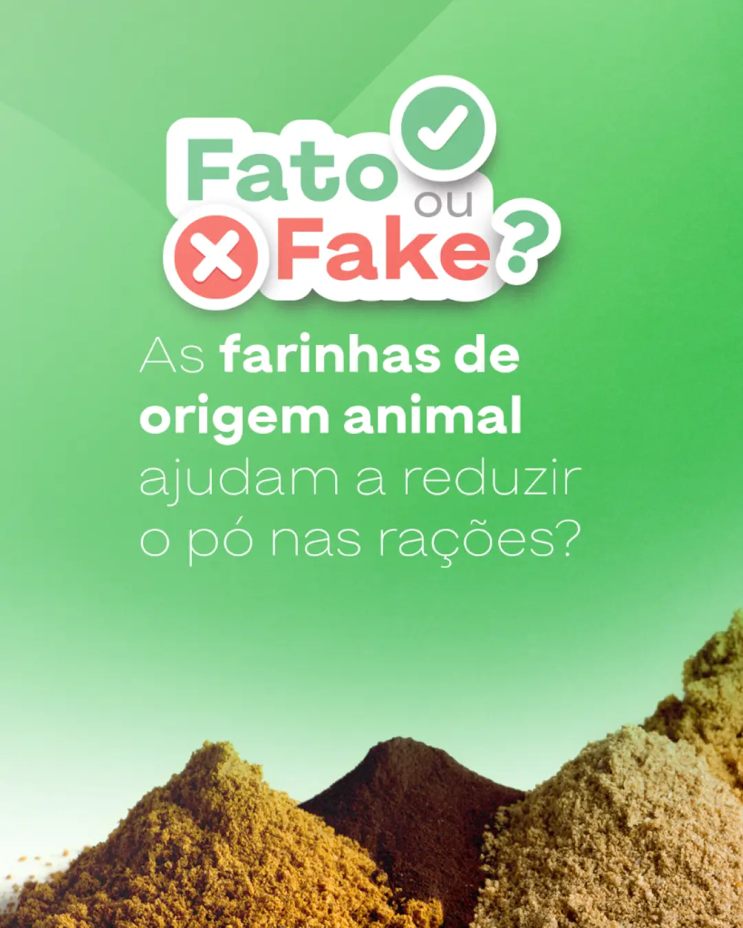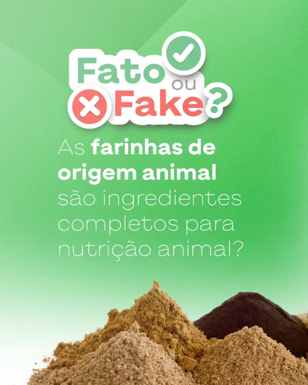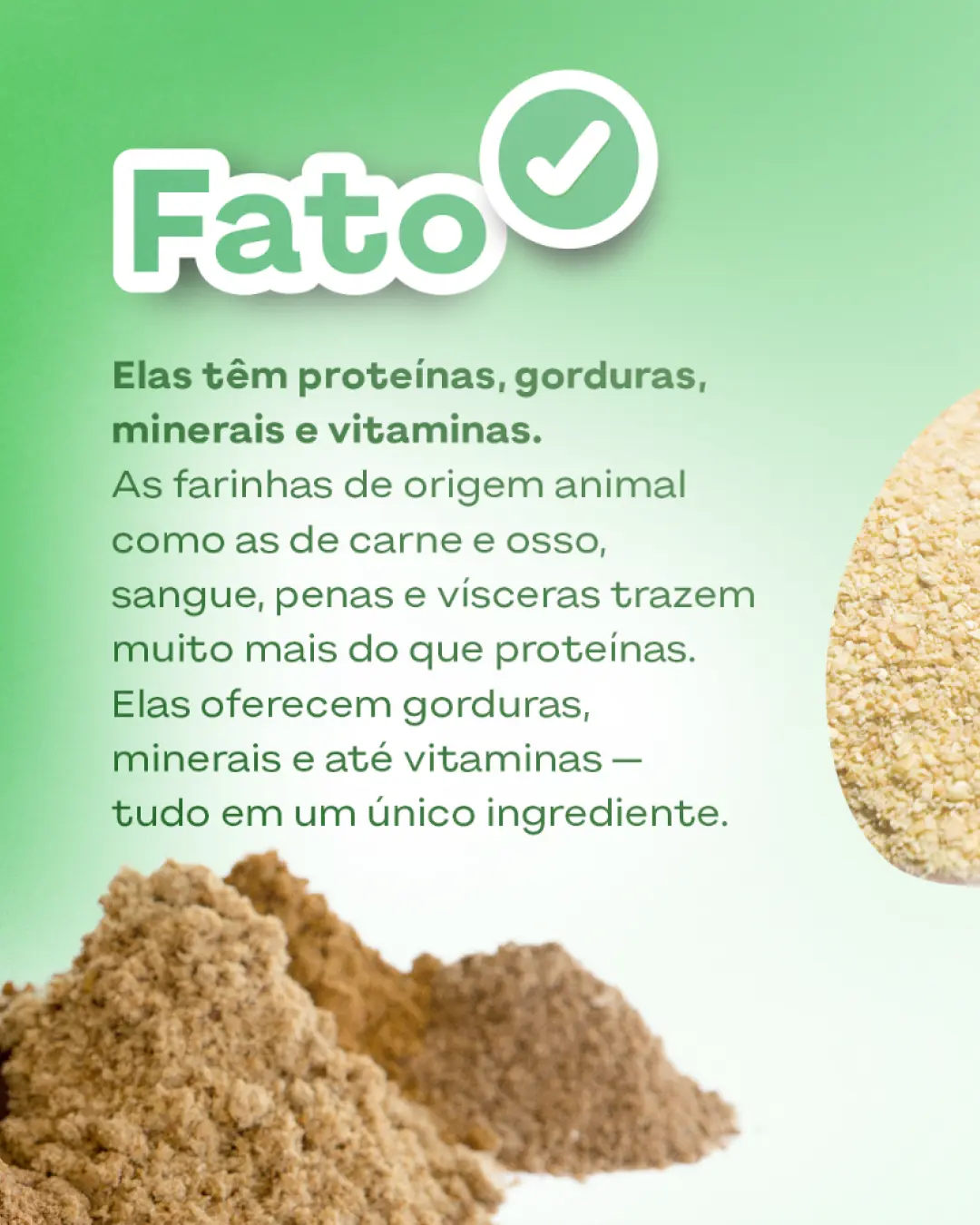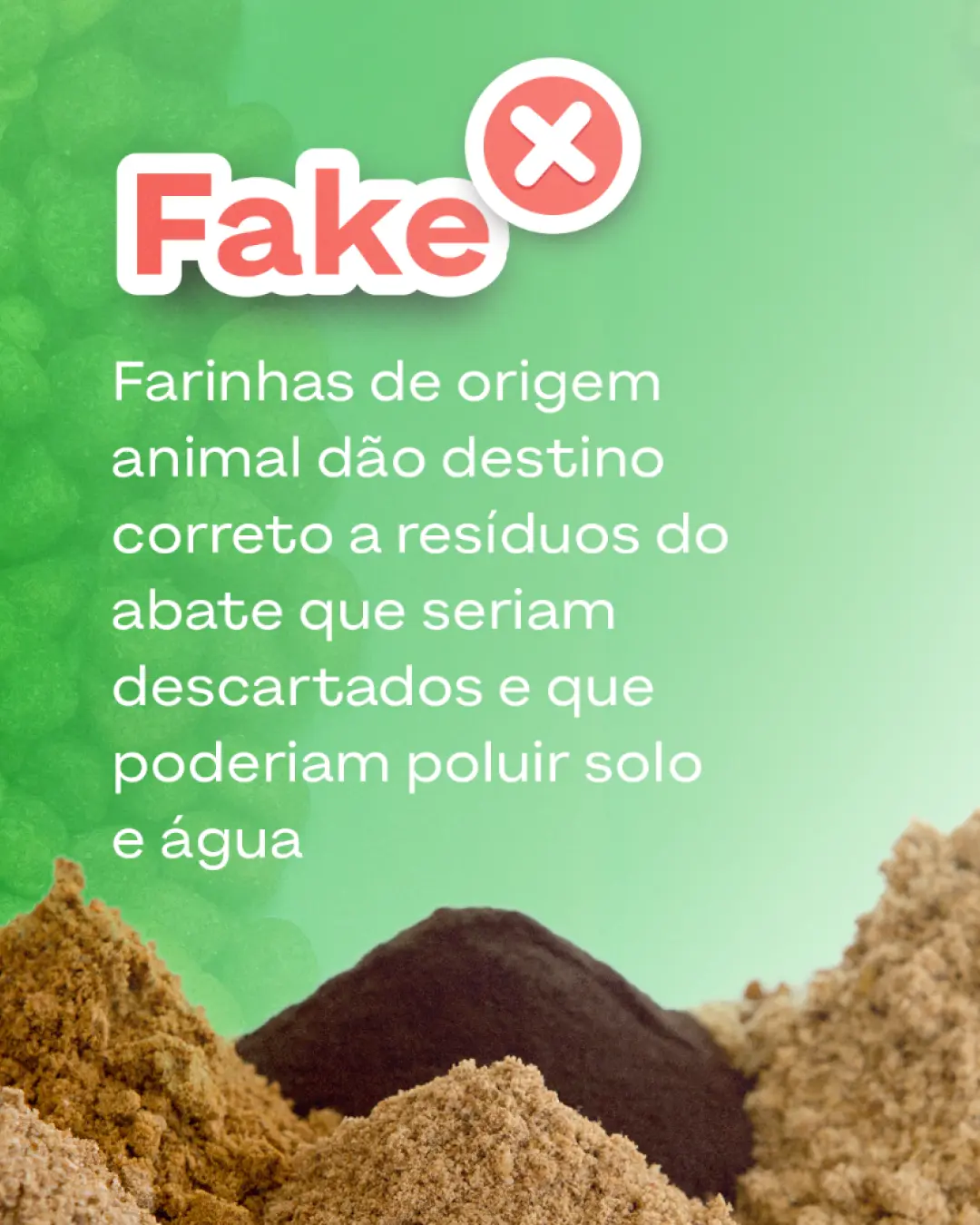 ❌ FAKE! Farinhas de origem animal dão destino correto a resíduos do abate que seriam descartados e que poderiam poluir solo e água.