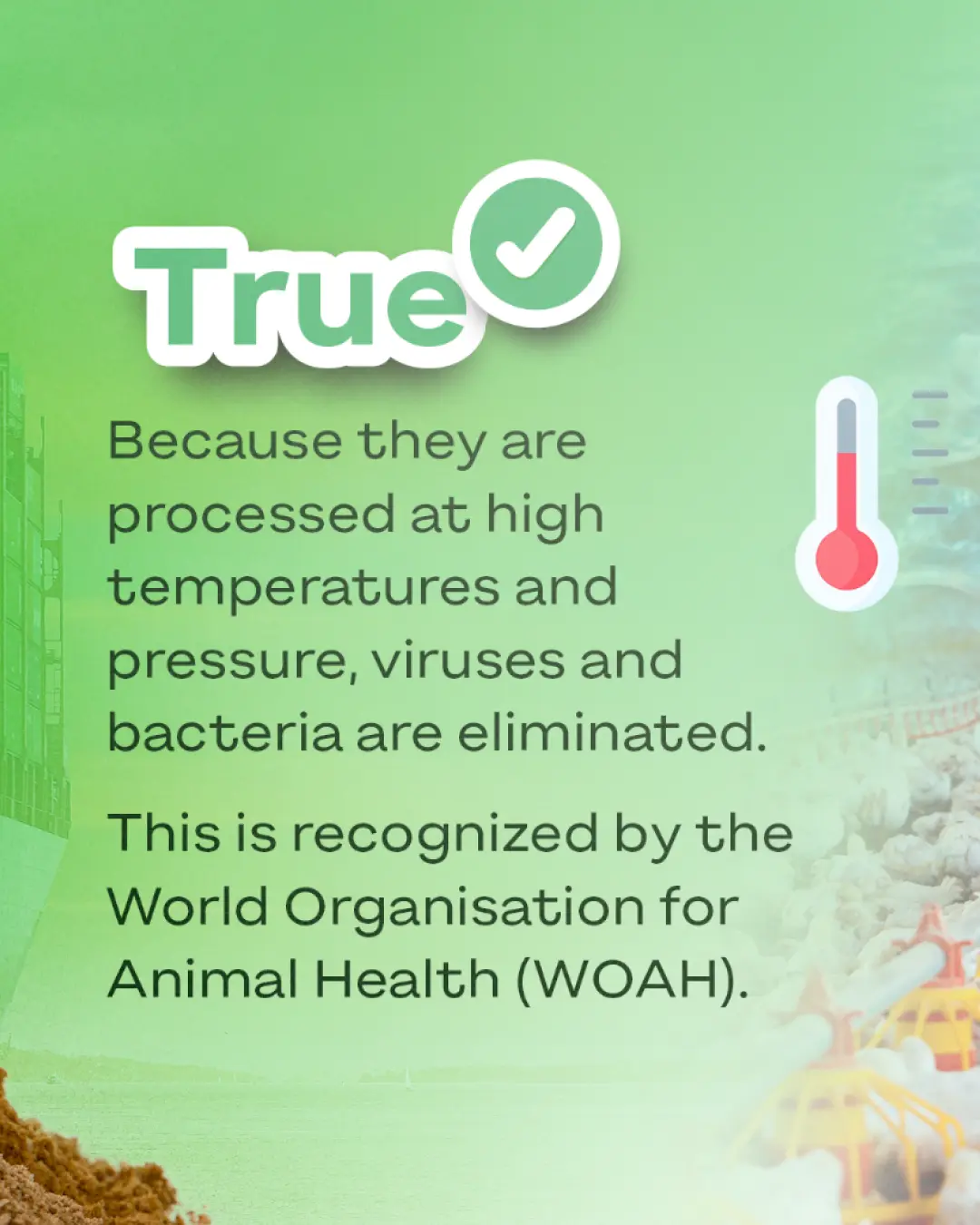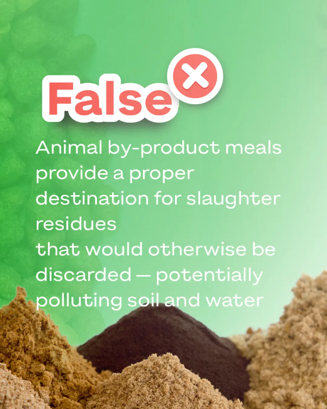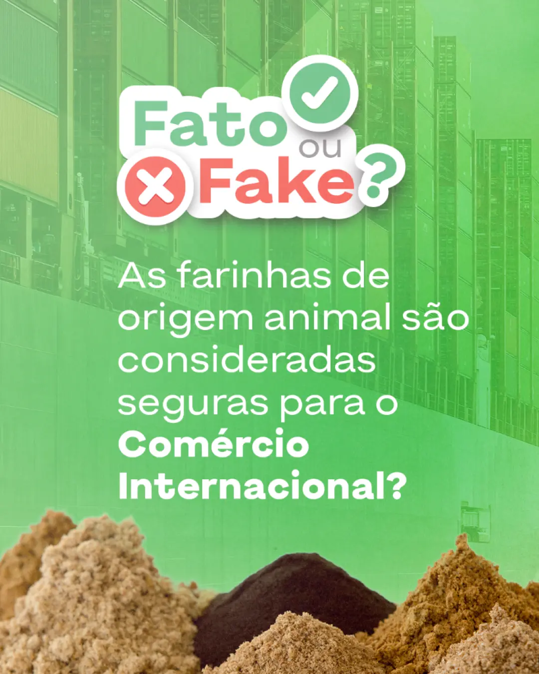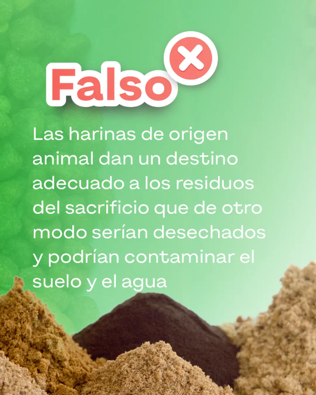 ❌ FAKE! Farinhas de origem animal dão destino correto a resíduos do abate que seriam descartados e que poderiam poluir solo e água.