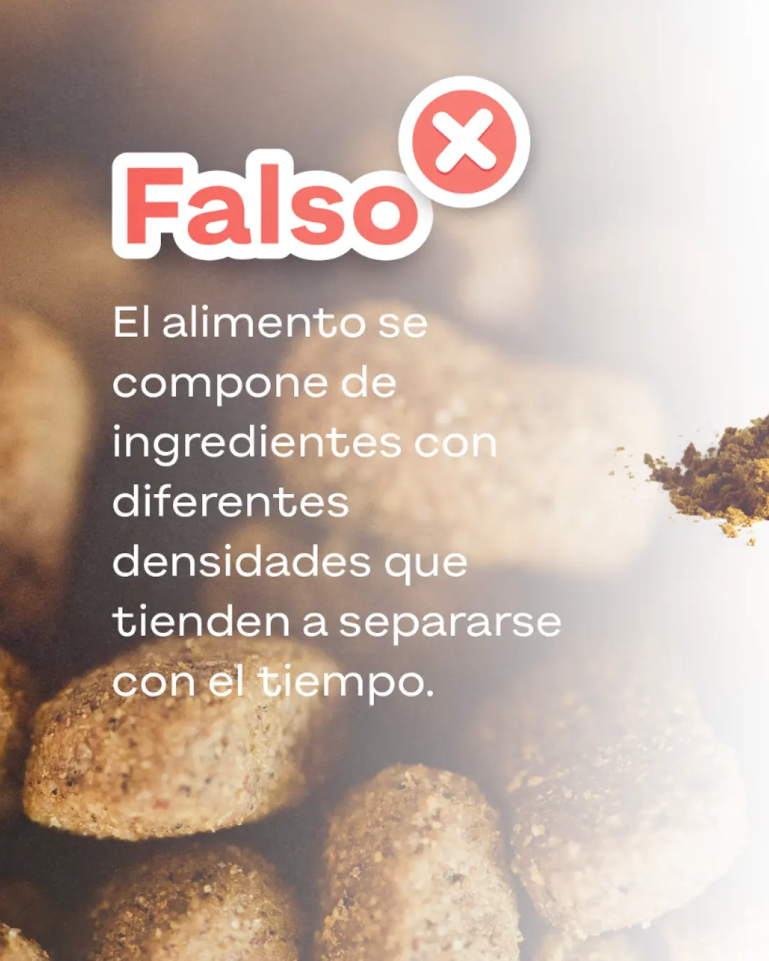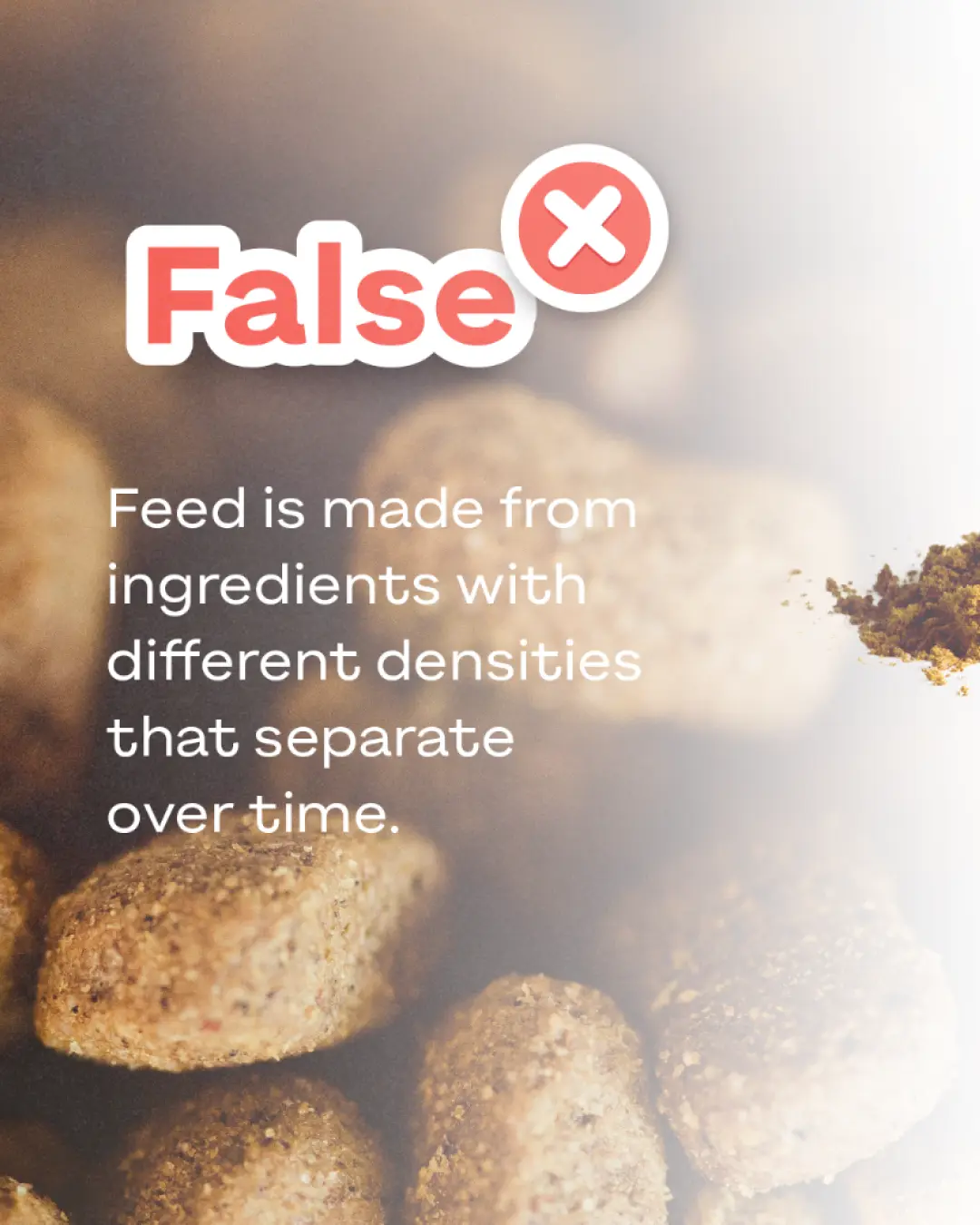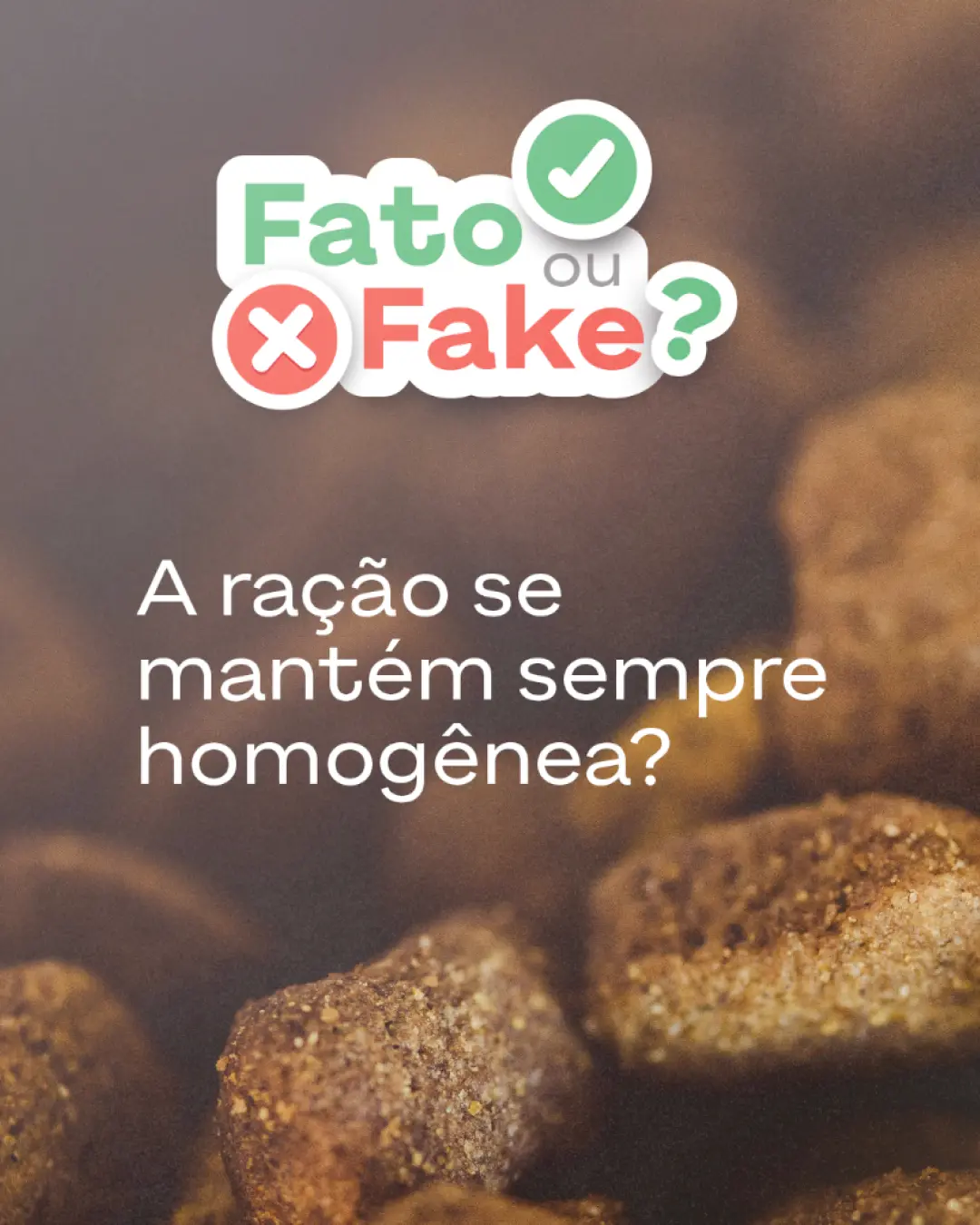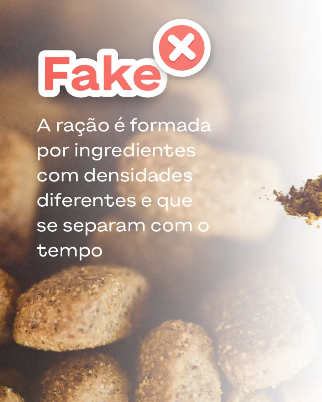 ❌ FAKE! A ração é formada por ingredientes com densidades diferentes e que se separam com o tempo.