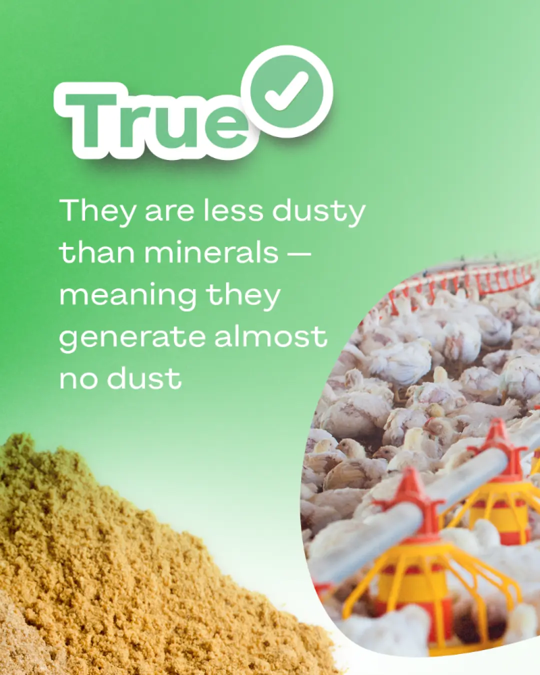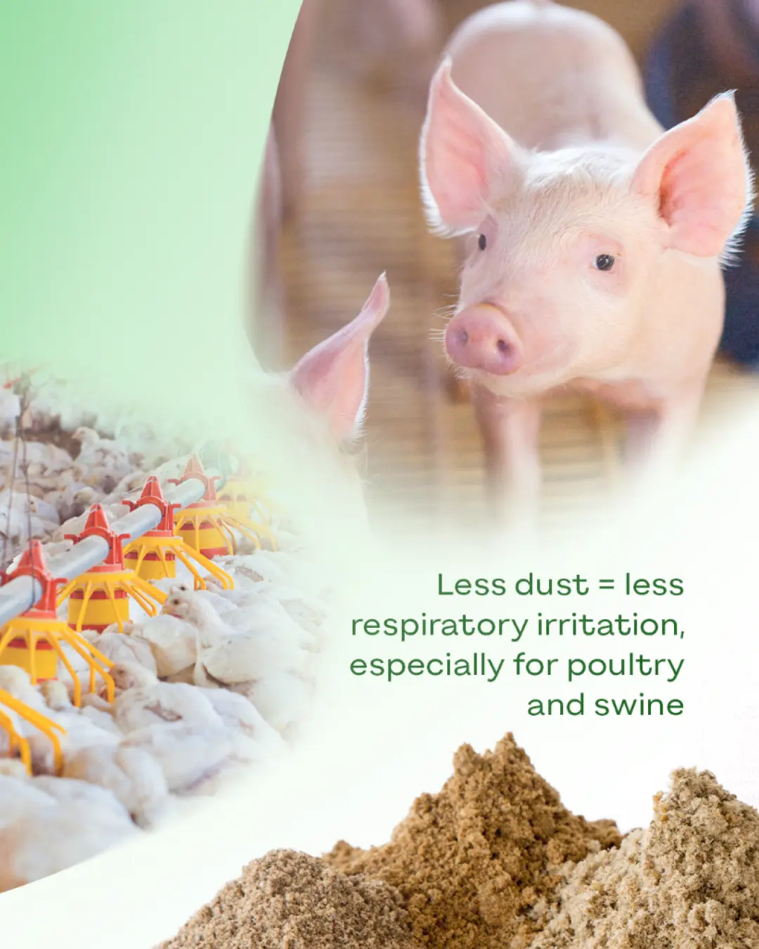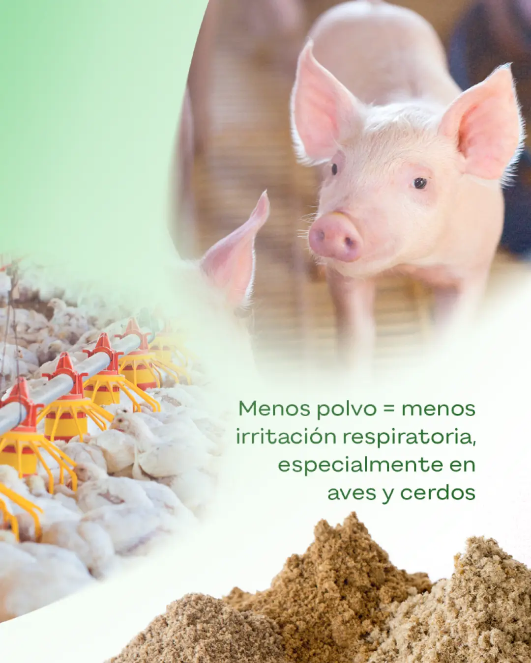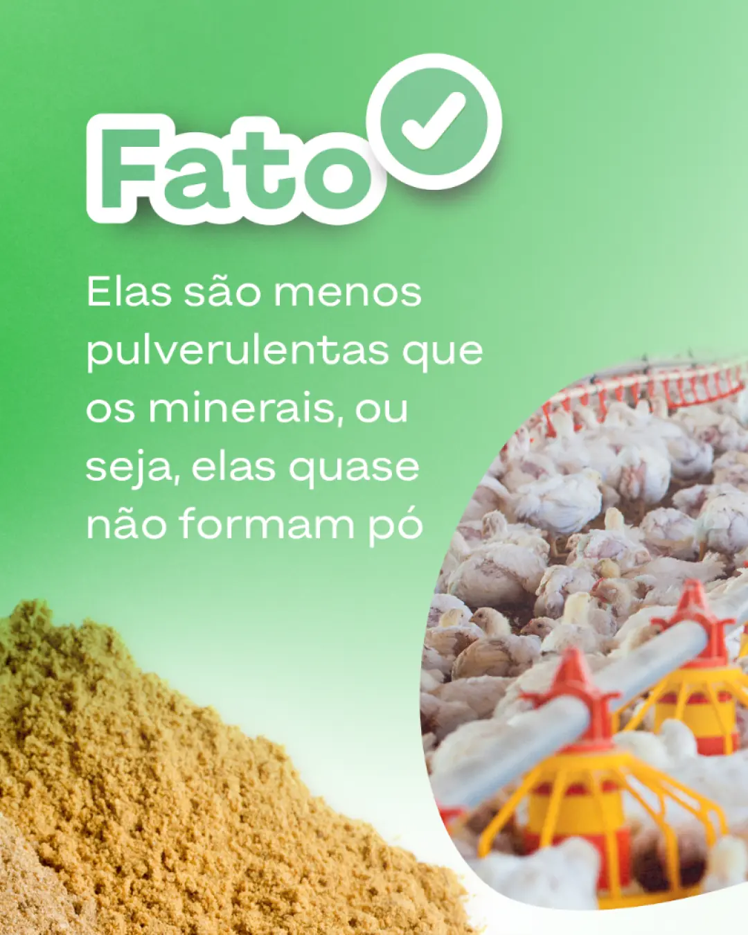 Menos pó = menos irritação respiratória, principalmente para aves e suínos.