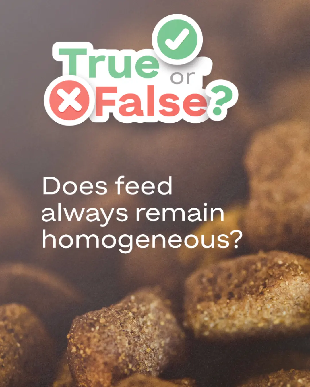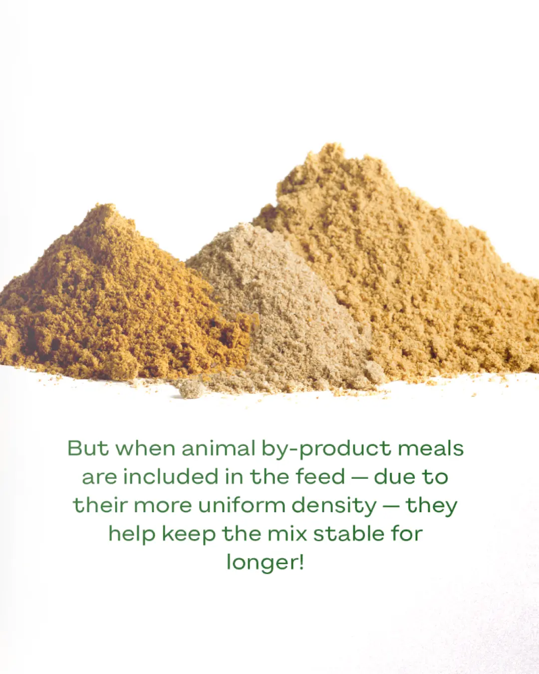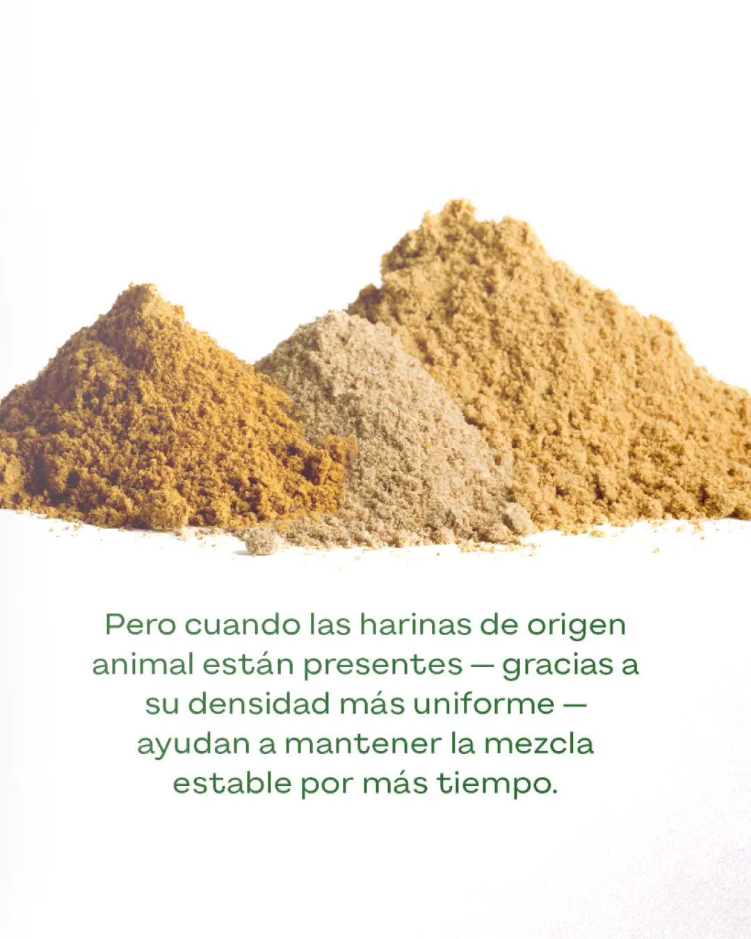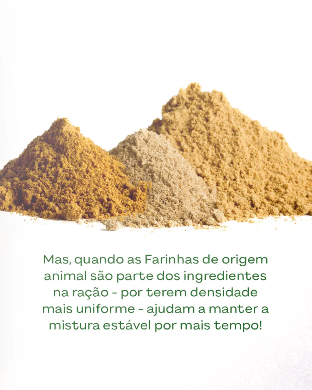 Mas, quando as Farinhas de origem animal são parte dos ingredientes na ração – por terem densidade mais uniforme – ajudam a manter a mistura estável por mais tempo!
